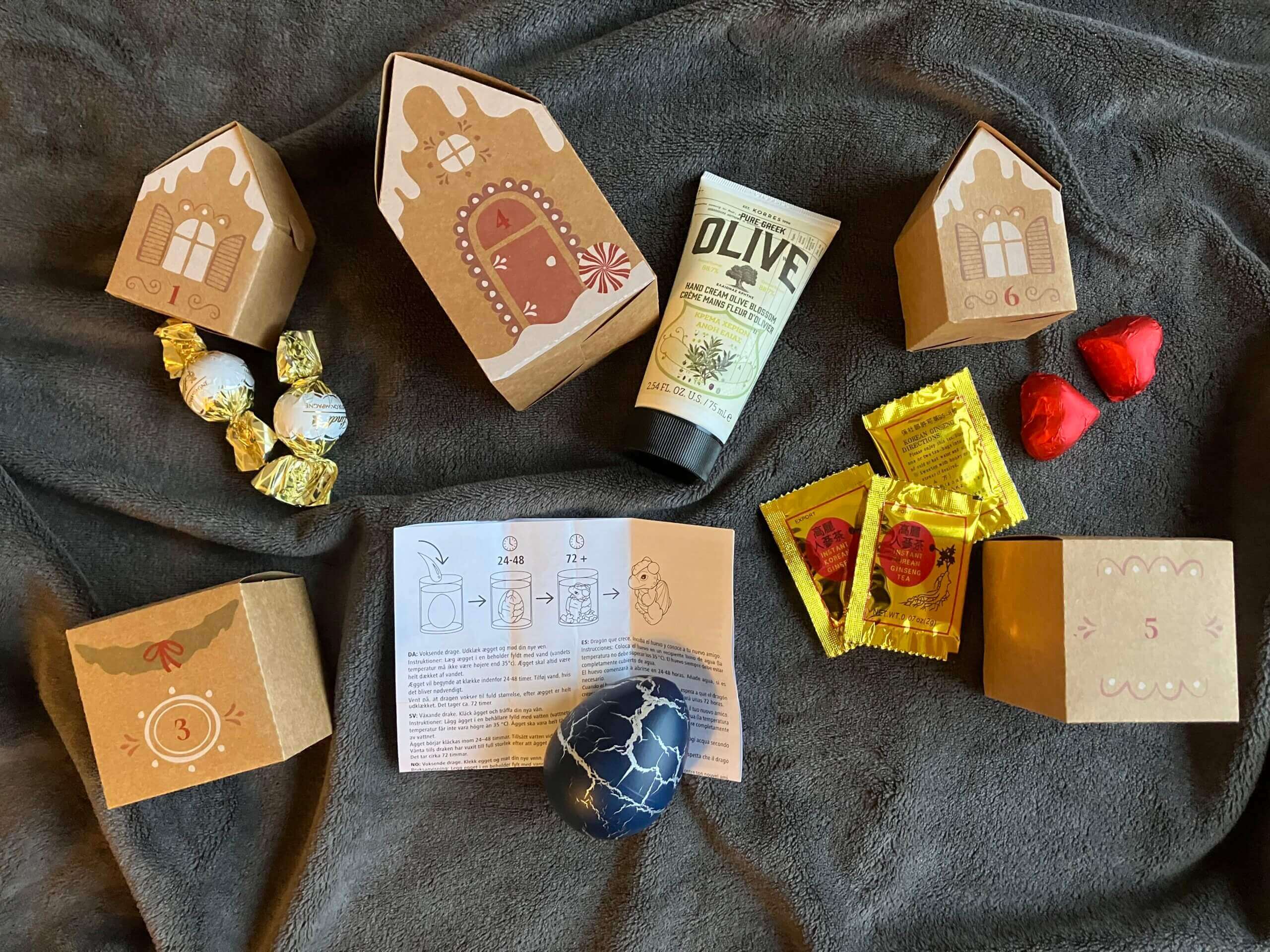 リンツのチョコレート、水に入れたらドラゴンが出てくるおもちゃ(笑)、ハンドクリーム、高麗人参茶、ハート型のチョコ、です。