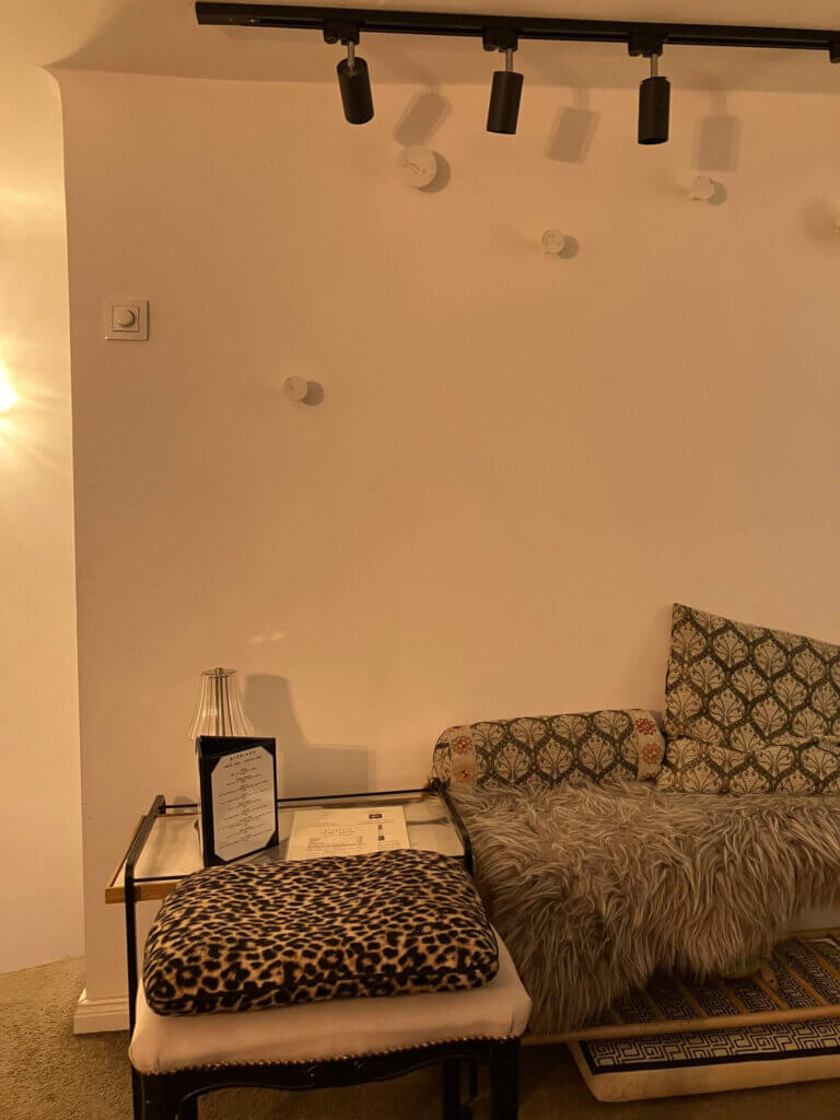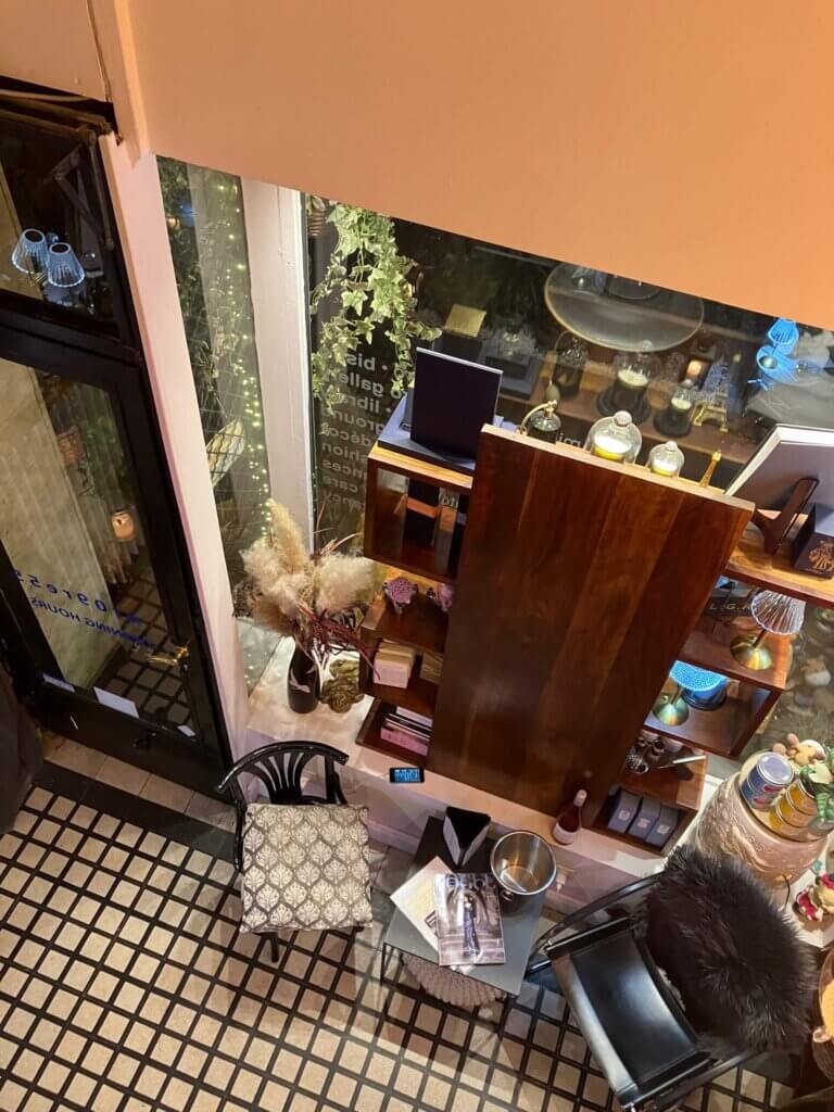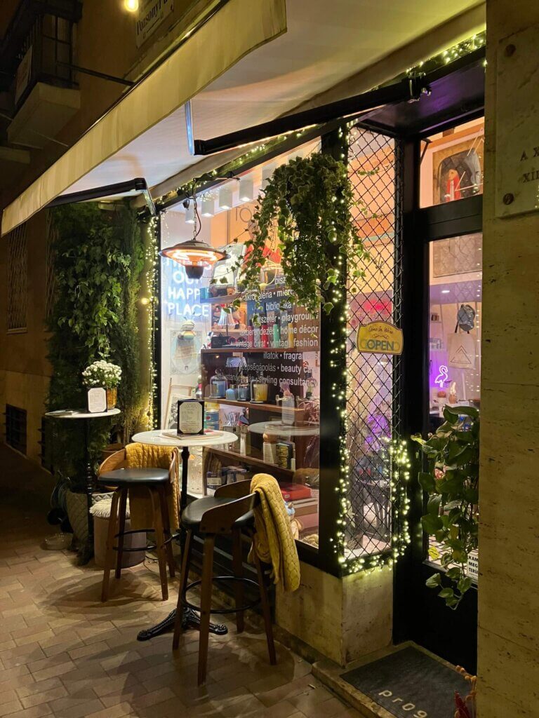 ここは私が通っているヨガクラスへの通り道にあり、テラスまで可愛いデコレーションで、前を通るたびにいいなあと思ってました。Googleで調べると、私の好きなイタリアのコスメブランド、サンタ・マリア・ノヴェッラの取り扱いがあることを知り、(ハンガリーでは買えるお店は他にないです。)カフェかバーなのに面白い場所だなあと思ってました。
