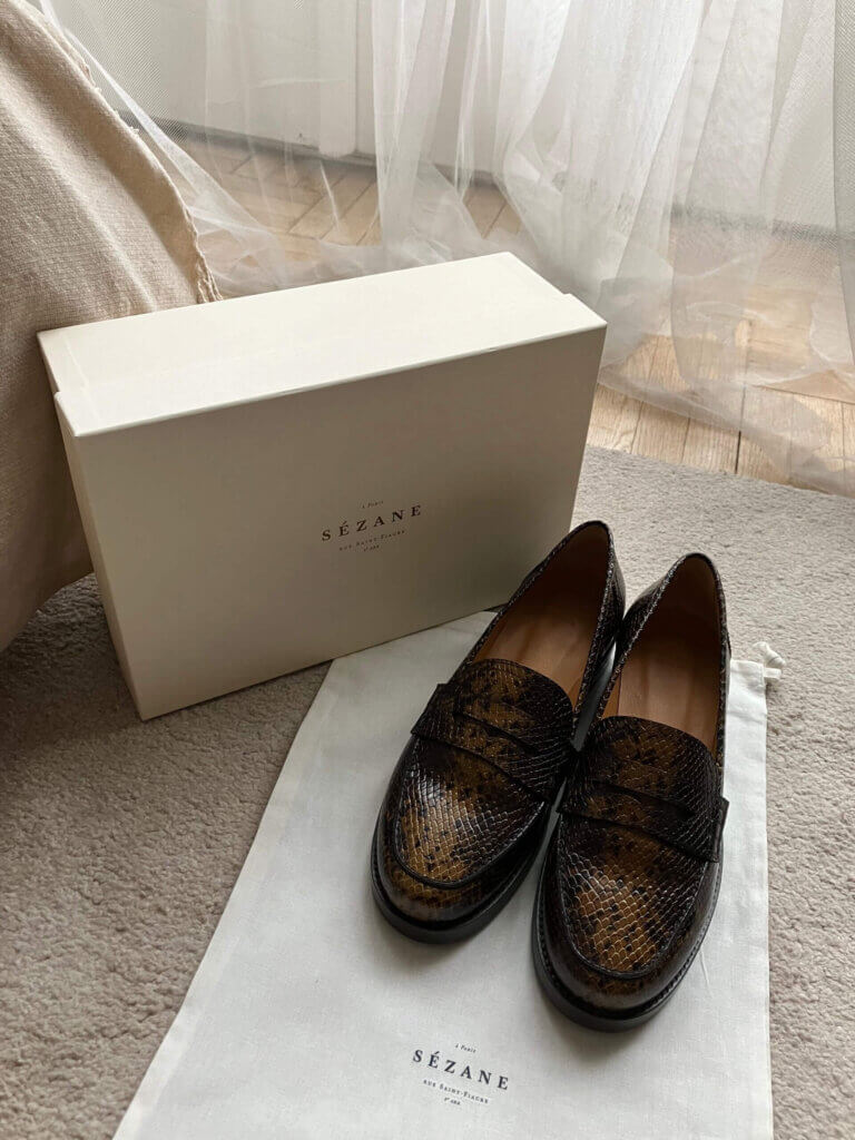 最近Sézaneで買ったのがこちらのローファーです!ローファーってあんまり興味なかったんですが、パイソン柄の型押しで、「良い子」じゃないイメージに一目惚れ。ちょっとセクシーに履きこなせそう。オリジナルのエコバッグもついてた!嬉しい!