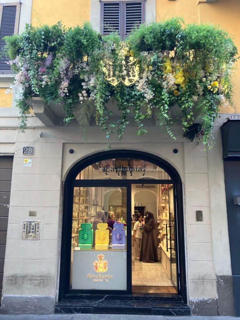 同じ通りには、カプリ島の香水ブランド、カルトゥージアが。ここもグリーンとお花の装飾がとても素敵・・・
