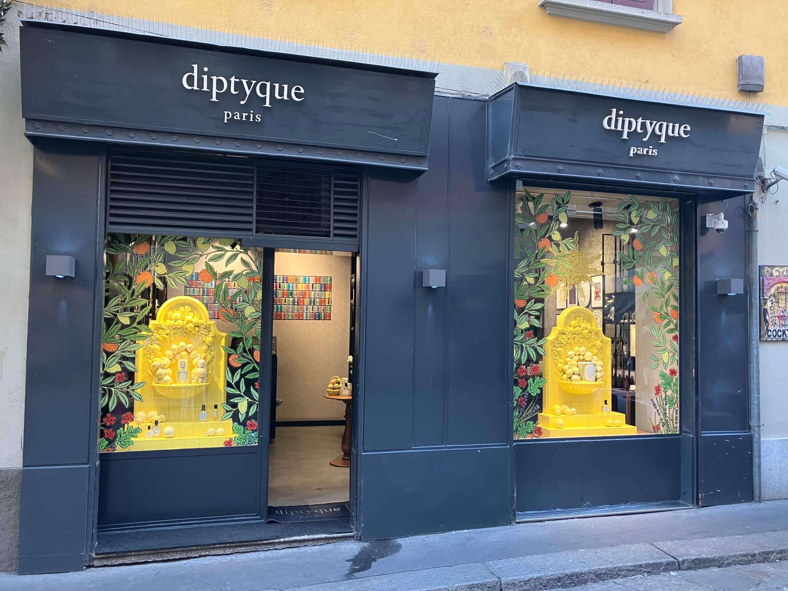 このなんとも言えないグレーの店構えがディプティックらしいです。ショーウィンドウのレモンイエローと相まって、華やかで楽しげなのに、シックな高級感も損なっていませんね。