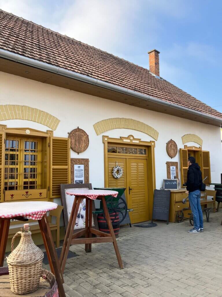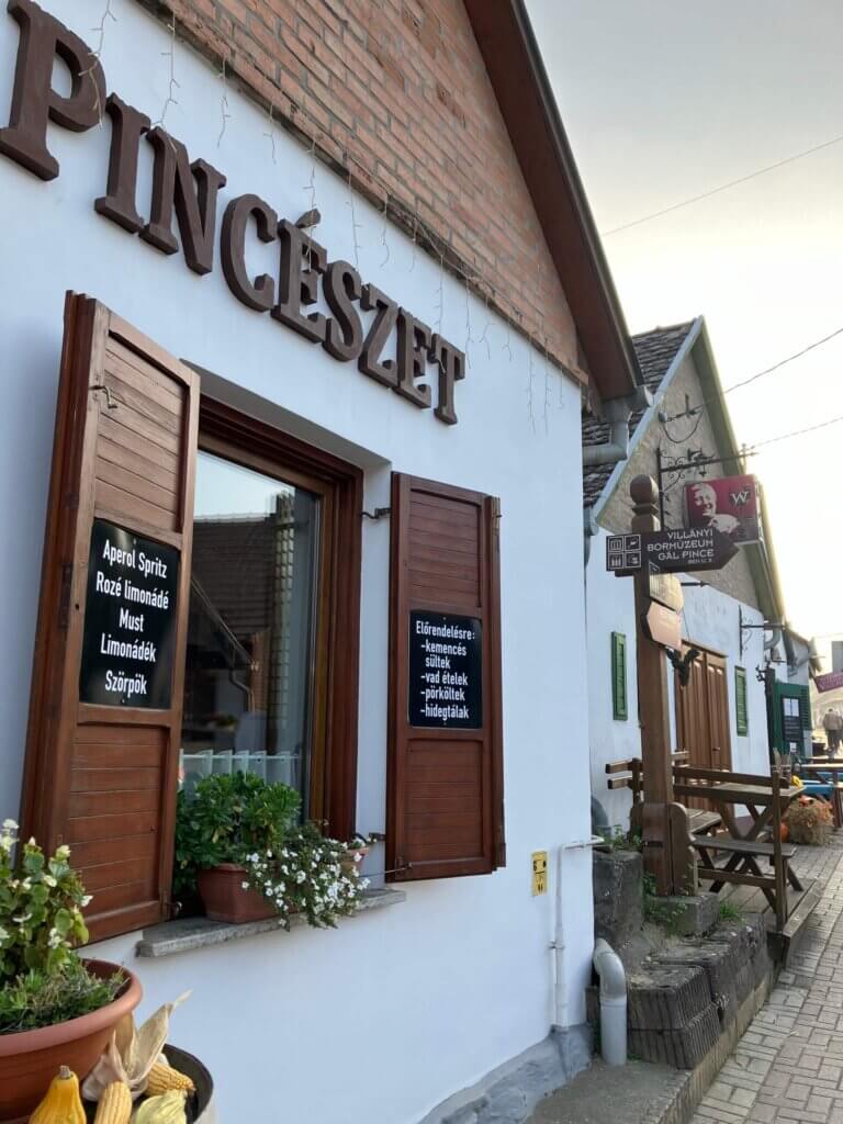 Pincészetと書いた可愛い建物が通り沿いにいくつも並びます。Pincészetはハンガリー語でワイナリーです。